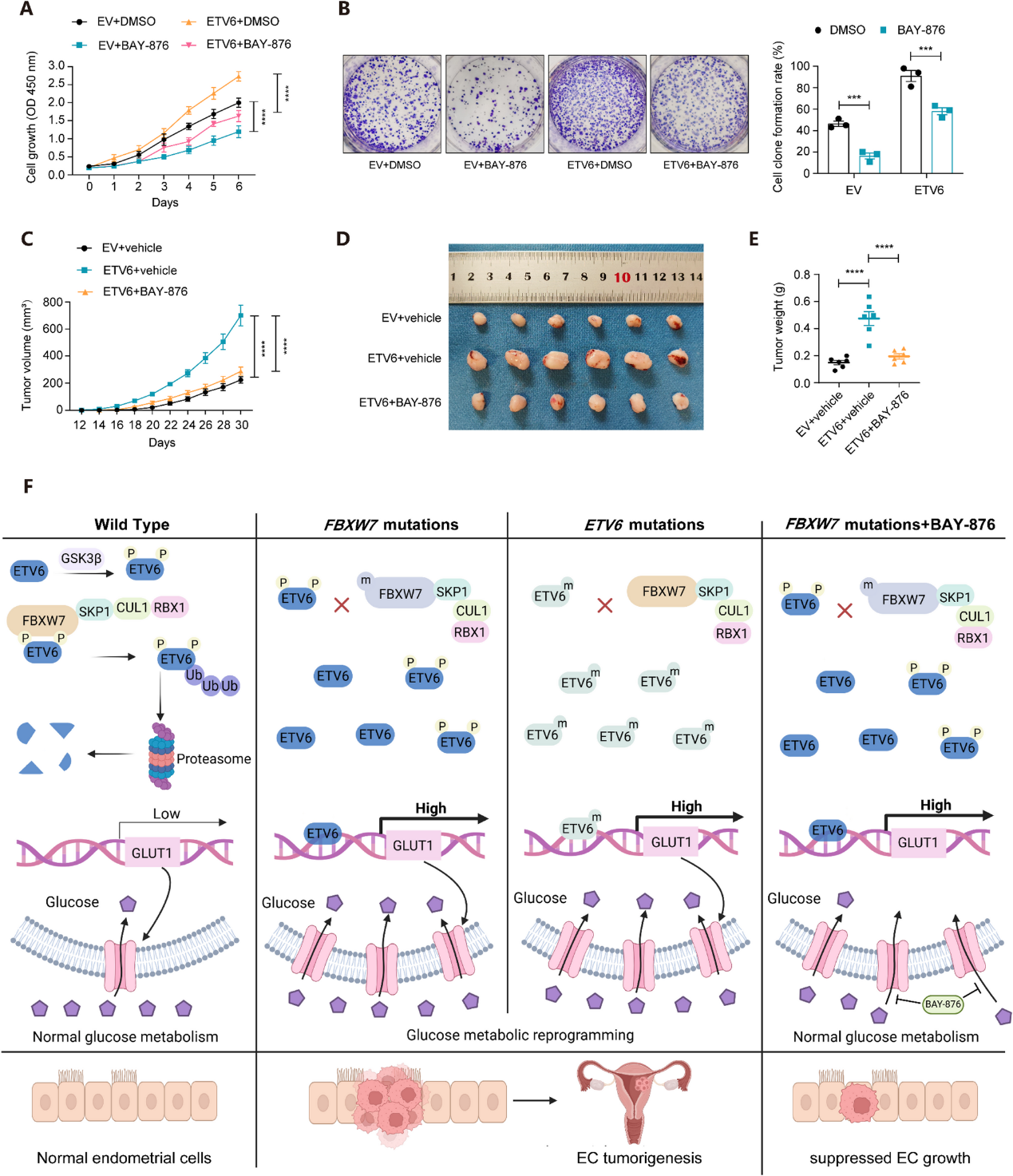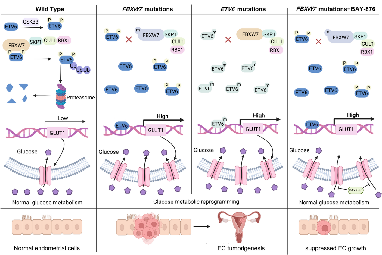 子宫内膜癌是女性生殖道最常见的恶性肿瘤之一,近年来其发病率在全球范围内呈持续上升趋势。在子宫内膜癌的发生发展过程中,癌细胞会经历显著的代谢重编程,以满足其不受限制的快速增殖所带来的巨大能量与生物大分子需求。这一代谢重塑过程通常由抑癌基因和致癌基因的突变所驱动。FBXW7作为一种经典的肿瘤抑制基因,在子宫内膜癌等多种癌症中经常发生功能丧失性突变。然而,尽管 FBXW7突变在肿瘤发生发展中的关键作用已获广泛公认,但其是否存在可供临床干预的代谢脆弱性,及其背后的具体分子机制仍待进一步阐明。近日,复旦大学生命科学学院王陈继团队与同济大学附属上海市附属第一妇婴保健院高昆团队合作,在Molecular Cancer在线发表了题为 “FBXW7mutations reprogram glucose metabolism by activating the ETV6-GLUT1 axis” 的研究文章。该研究首次鉴定并揭示了一条未被充分认识的全新代谢调控通路,系统阐明了FBXW7突变在子宫内膜癌细胞中重塑葡萄糖代谢的关键分子机制。研究团队通过转录组学、蛋白质亲合纯化质谱)(AP-MS)等多组学联合筛查