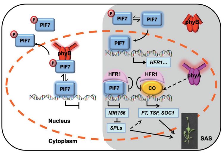 在遮荫条件下,PIF7发生去磷酸化,抑制了MIR156,从而促进了SPLs的表达,加速开花;同时,在遮荫条件下,CO积累增加,上调了FT,TSF和SOC1的表达,也引起早花,该过程受到庇荫反应负调控因子HFR1的平衡。该研究还发现,PIF7和HFR1均独立于phyA介导的开花途径。因此,该研究鉴定了遮荫条件下促进植物开花的遗传组分,并揭示了遮荫促进了植物开花的分子机制。