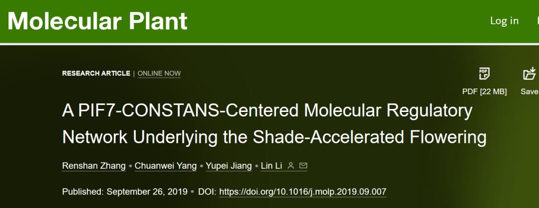 9月27日,《分子植物》(Molecular Plant) 在线发表了复旦大学李琳研究组题为“APIF7-CONSTANS-Centered Molecular Regulatory Network Underlying theShade-Accelerated Flowering”的研究论文。该研究揭示了遮荫促进植物开花的分子机制。