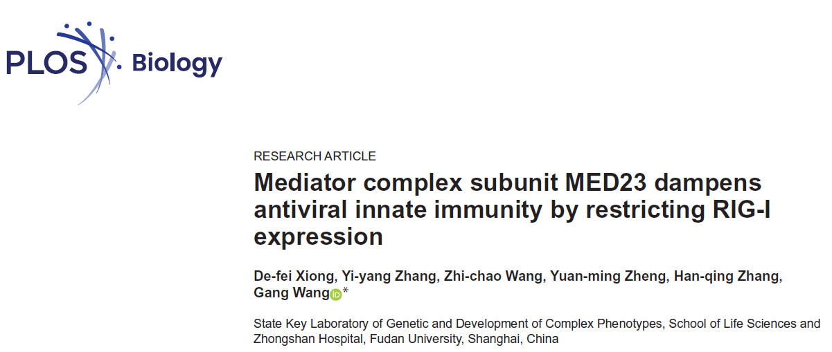 2025年7月24日,复旦大学王纲教授团队在PLOS Biology 期刊在线发表了题为 “MED23 dampens antiviral innate immunity by restricting RIG-I expression”的研究论文。该研究通过系统的体内外实验,首次揭示了转录中介体复合物(Mediator)亚基MED23在抗病毒天然免疫应答中的关键负调控作用,其机制在于通过与转录因子FOXO3协作,抑制关键模式识别受体RIG-I的基因表达。