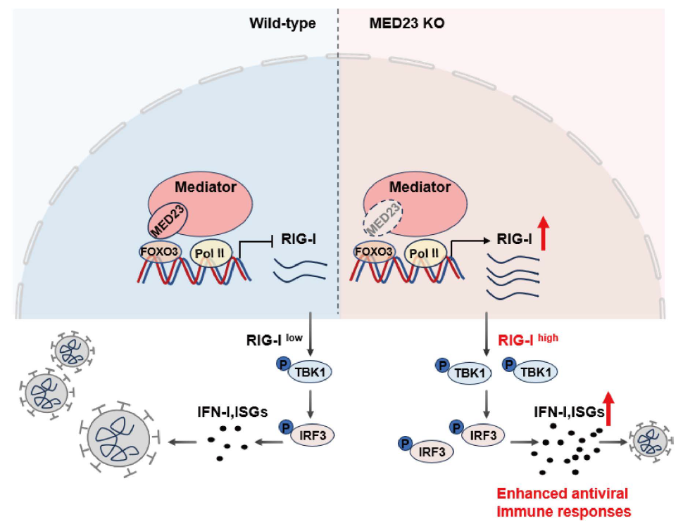 该研究阐明了MED23-FOXO3转录调控轴通过抑制RIG-I基因表达来负向调控抗病毒天然免疫反应的分子机制,极大地丰富了RIG-I信号通路的调控网络,揭示了核内转录调控机器在抗病毒免疫源头——模式识别受体表达层面的关键调控作用。研究不仅深化了对宿主抗病毒防御与免疫平衡调控机制的理解,也为未来开发靶向MED23-FOXO3-RIG-I调控轴的新型广谱抗病毒策略提供了新的理论见解和潜在干预靶点。