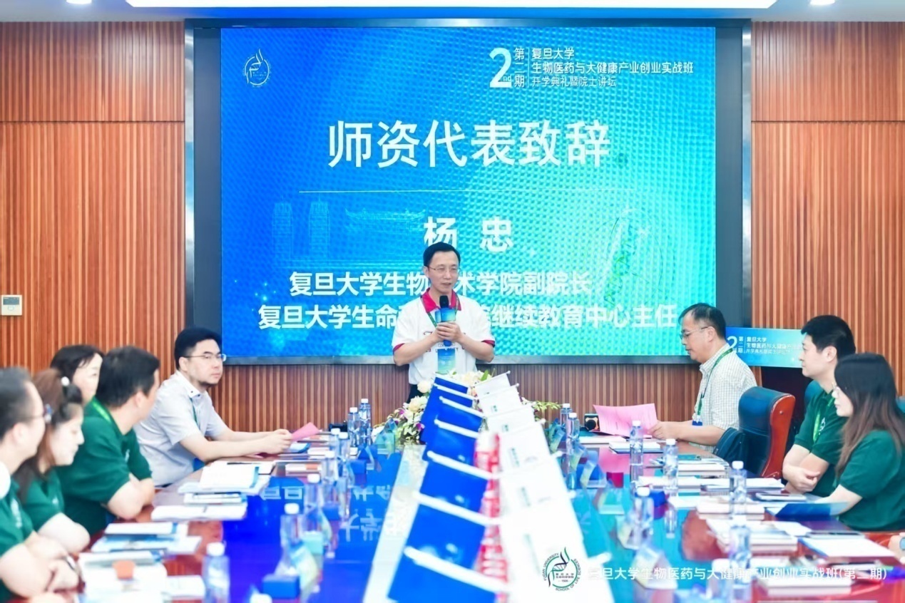 作为师资代表,复旦大学生命科学学院继续教育中心主任、复旦大学生物技术学院副院长杨忠发言。他详细介绍了实战班的师资构成与课程体系,强调师资团队涵盖顶尖科学家、产业领军者、临床专家及创投大咖,将以“理论 + 实战”的模式,为学员提供全方位指导。杨忠指出“我们不仅注重知识传授,更关注学员的实际需求,后续会持续优化课程,确保教学内容与产业发展同频共振。”