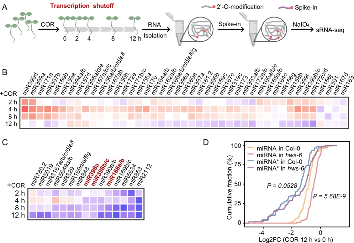 A. 转录抑制结合OX-sRNA-seq实验流程图。 COR:Cordycepin,虫草素。B&C. 热图展示部分 miRNA 在转录抑制不同时间后的丰度变化。D. 累积分布曲线展示转录抑制12小时后miRNA和miRNA*在野生型及hws-6中的丰度变化。