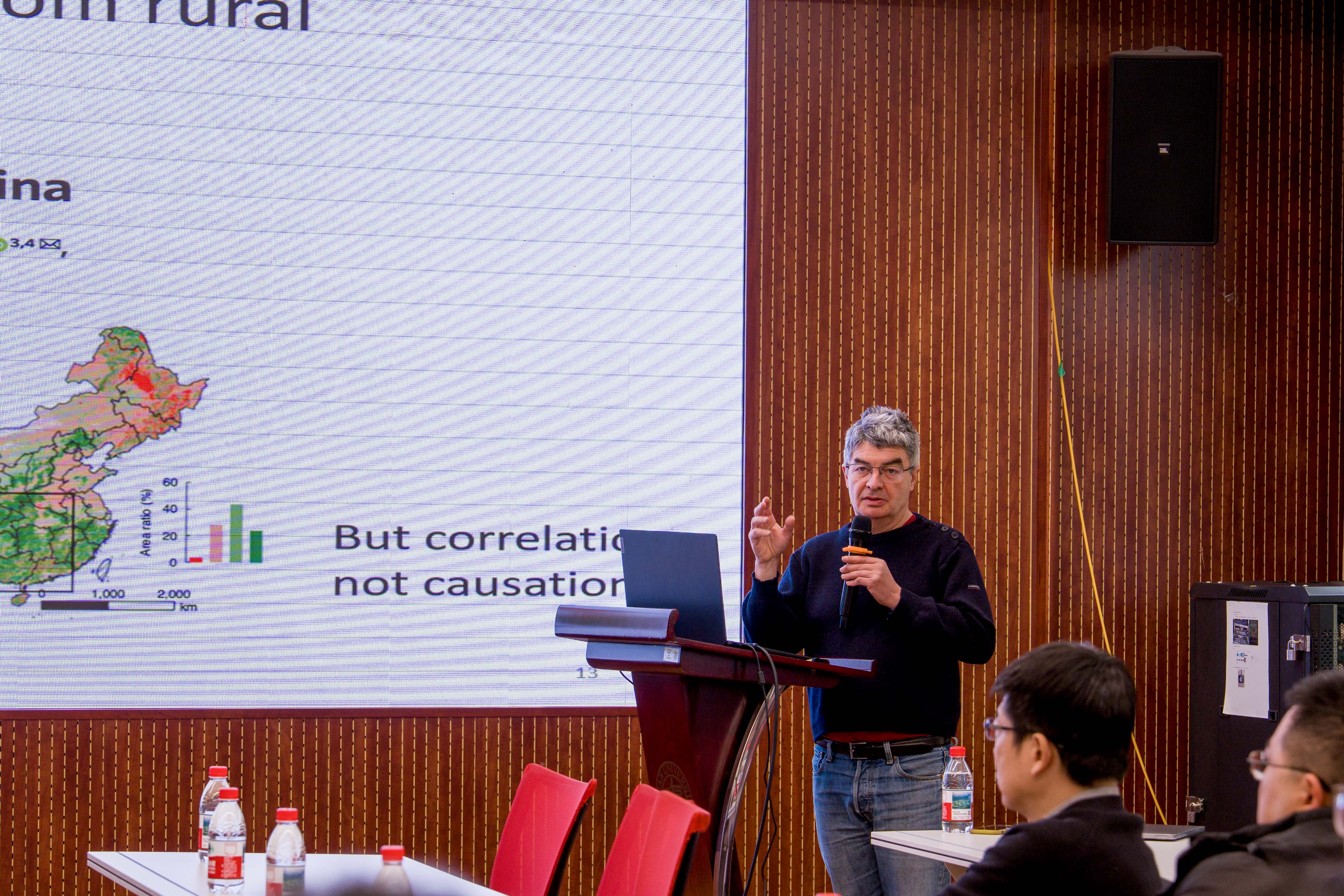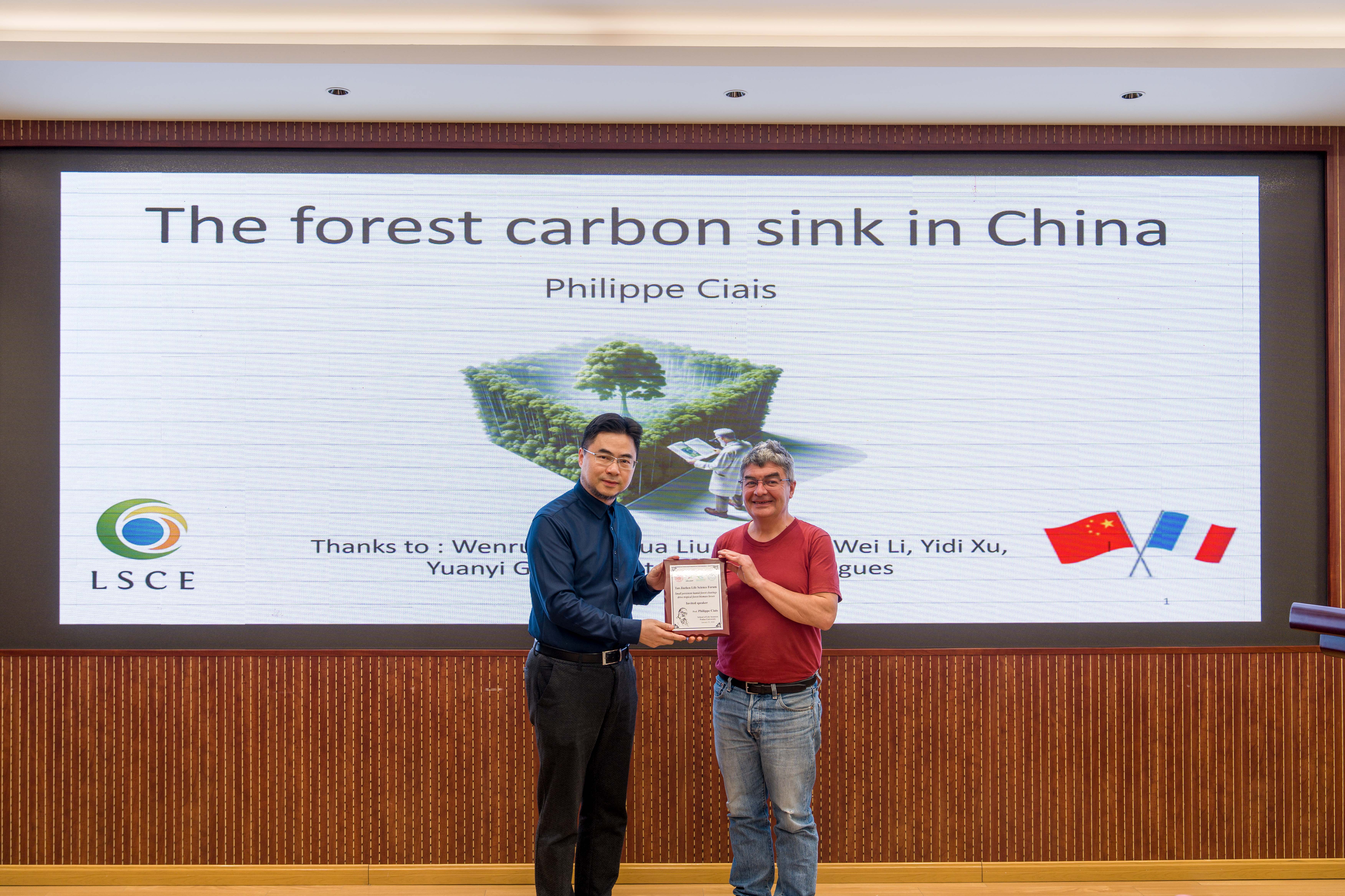 Philippe Ciais院士作了题为 “The Forest Carbon Sink in China” 的学术报告。报告回顾了中国科学家过去几十年来在生态系统碳循环领域取得的一系列重要研究成果。相关研究融合森林资源清查、野外台站观测、遥感监测及模型模拟等多种技术手段,系统揭示了中国森林碳汇的时空演变特征。结果显示,中国森林每年吸收的碳量约相当于当年化石燃料碳排放量的8%–14%,在全球陆地碳汇中发挥着重要作用。这主要得益于持续推进的植树造林等生态工程与不断加强的森林经营管理——这些举措在扩大森林面积的同时,也有效降低了森林破碎化程度,从而推动了中国森林碳汇能力的持续提升。然而,Philippe Ciais院士指出,当前学界对于气候变化与人类活动等多重扰动因素在陆地碳汇变化中的具体贡献仍缺乏精确量化,其中一个关键瓶颈是缺乏高时空分辨率的碳源汇变化数据。为突破这一局限,他介绍了团队利用高分辨率遥感观测数据构建森林碳汇扰动模型的最新研究成果,该模型通过精准刻画森林扰动过程,为国家乃至全球尺度森林碳汇的精准评估提供了新的技术路径。在报告最后,Philippe Ciais院士提出,未来应进一步加强遥感观测、大数据分析与人工智能等新技术的融合应用,以更精细地识别不同扰动过程及其对碳循环的影响,从而为全球碳收支评估和碳中和目标实现提供更加坚实的科学支撑。