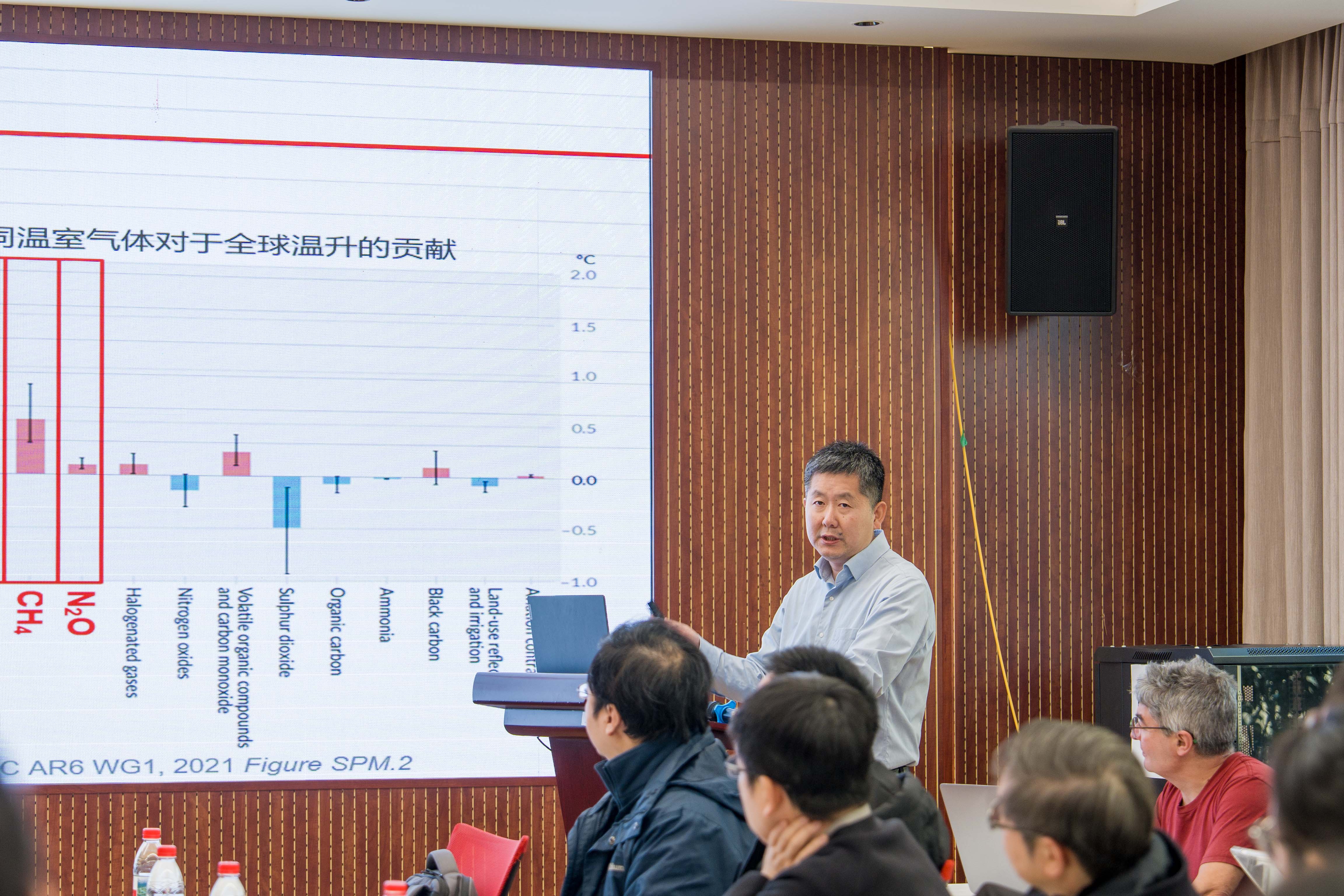 朴世龙院士作了题为“非CO₂温室气体与气候系统互馈研究挑战”的学术报告。他指出,在全球变暖背景下,推动甲烷(CH₄)和氧化亚氮(N₂O)等非CO₂温室气体减排,是成本低、见效快的气候变化减缓路径,也是我国实现“双碳”目标的重要国家需求。然而,目前相关基础研究仍相对薄弱,非CO₂温室气体与气候系统之间的互馈机制及其强度尚未得到有效量化。与大气CO₂浓度上升主要由化石燃料燃烧和土地利用变化等人为活动驱动不同,CH₄和N₂O的排放来源更为复杂,既包括湿地、土壤等自然过程,也受到农业生产等人类活动的显著影响,自然源与人为源的贡献较为接近。这种复杂的源汇结构使得非CO₂温室气体对气候变化的响应具有更高的不确定性。此外,当前多数地球系统模式仍以CO₂与气候系统的反馈模拟为核心,对CH₄和N₂O等非CO₂温室气体关键过程的刻画仍然不足,从而限制了对气候—温室气体反馈机制的系统认识。基于此,朴世龙院士指出,未来非CO₂温室气体研究不宜简单沿用CO₂研究的分析框架,亟需发展新的研究思路与方法体系,以深化对非CO₂温室气体与气候系统互馈关系的理解,为全球气候变化预测和减排策略制定提供更加坚实的科学支撑。