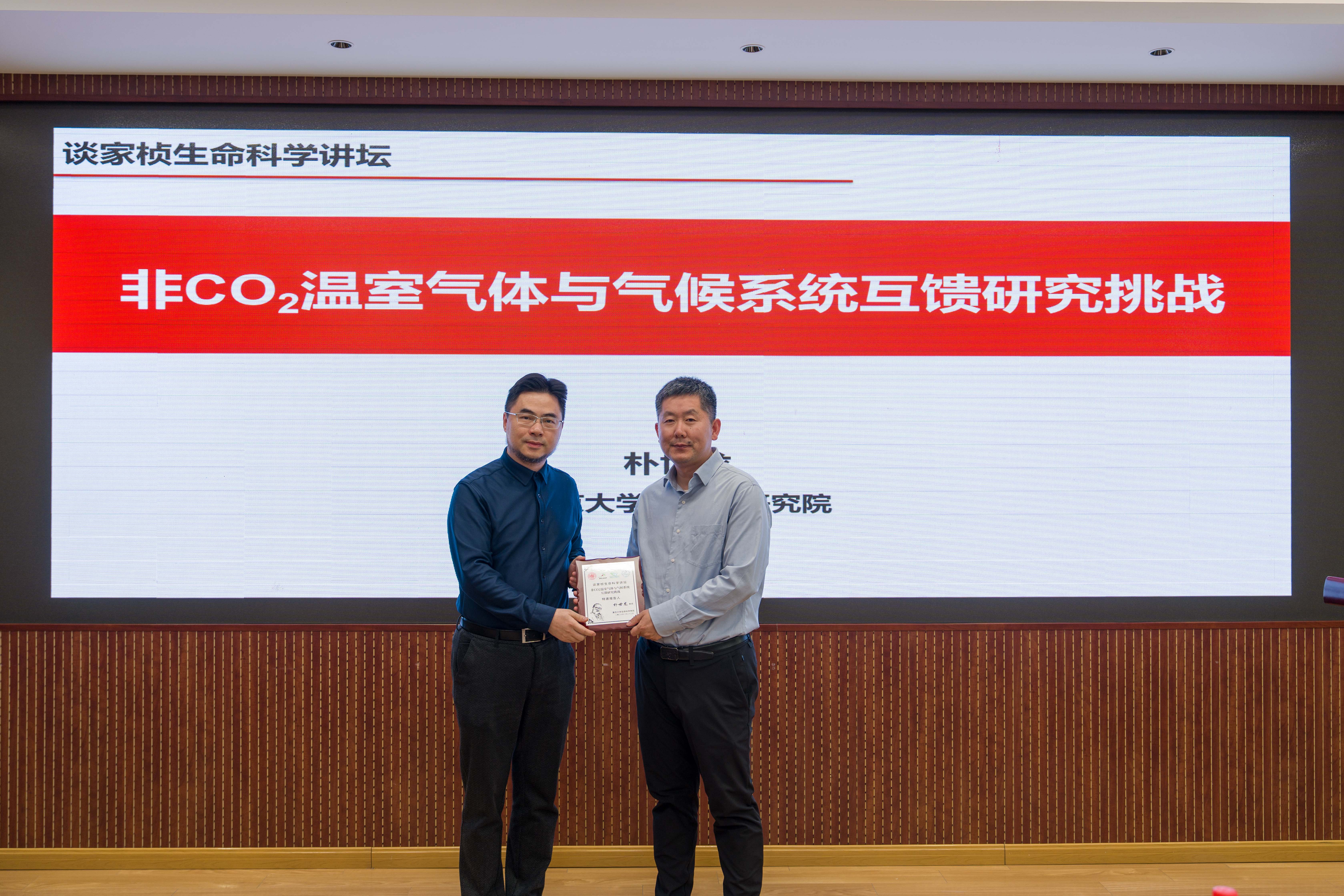 复旦大学生命科学学院院长罗凌飞教授向两位主讲人颁发“谈家桢生命科学讲坛”主讲人荣誉纪念牌。