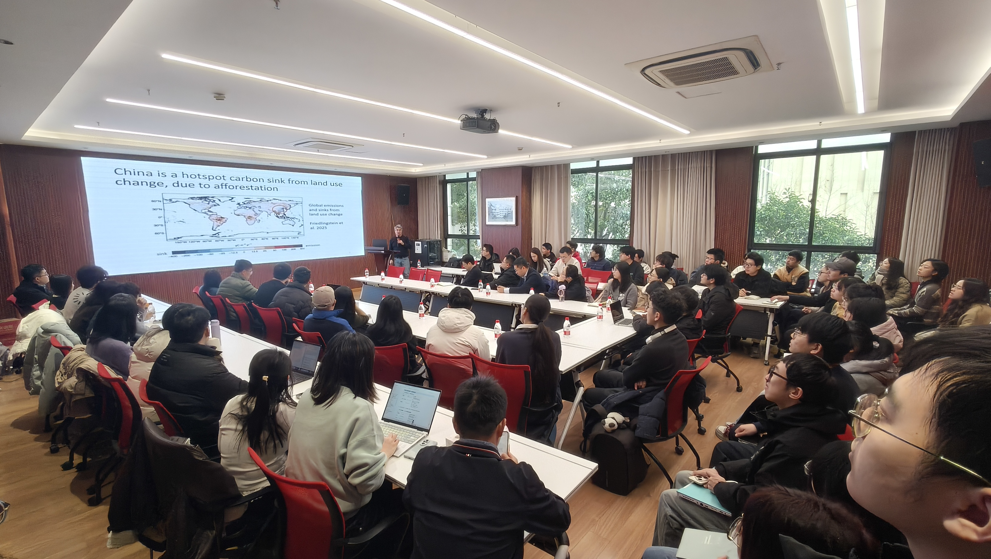 本次报告内容丰富、视野开阔、思想深刻,使在场师生受益匪浅。报告现场气氛热烈、座无虚席。报告结束后的交流环节中,师生们踊跃提问,围绕“森林碳汇评估的不确定性来源” 、“非CO₂温室气体对气候变化响应的模型模拟”等问题展开深入讨论。现场提问不断,交流气氛十分活跃,丰富而深入的问题一度超出了原定的交流时间。正式报告结束后,仍有不少师生围绕相关科学问题与两位院士进行了面对面的深入交流。