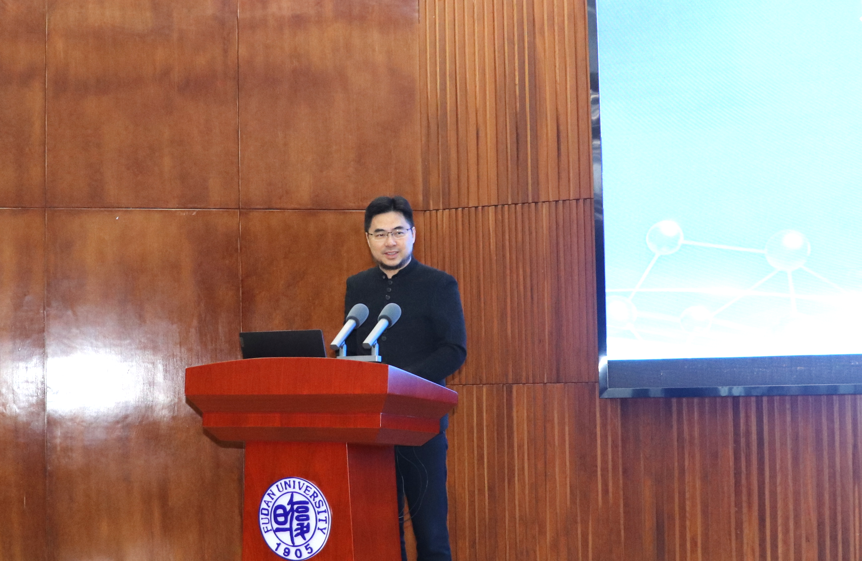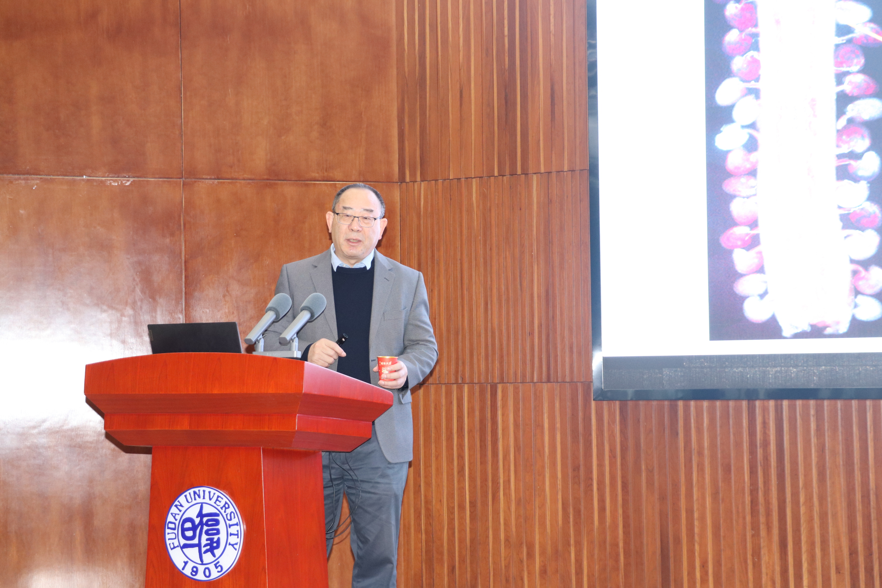 复旦大学生命科学学院生物化学与生物物理学系主任董爱武教授为杨维才院士颁发“谈家桢生命科学讲坛”主讲人荣誉纪念牌。