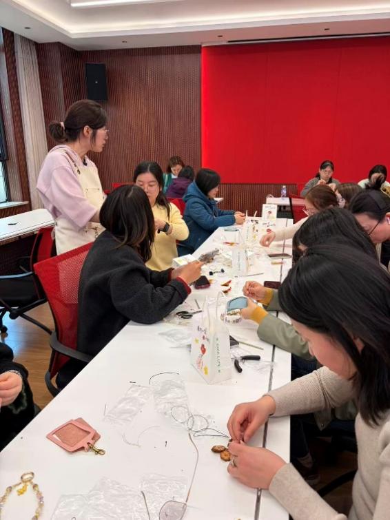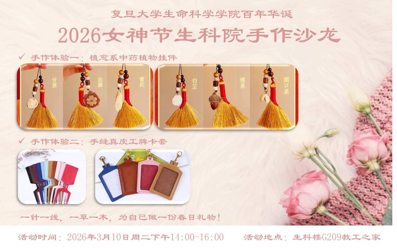 春风送暖,巾帼绽芳。为庆祝第116个国际妇女节,迎接学院百年华诞,切实关怀学院女教职工的健康发展,丰富校园文化生活,2026年3月10日下午,复旦大学生命科学学院在G209学院教工之家成功举办女神节手作沙龙。学院的教师、博后、助理等女教职工齐聚一堂,以草木为媒、以针线寄情,在沉浸式手作中舒缓教学科研压力、凝聚情谊,度过了一段兼具仪式感与治愈力的美好时光。
