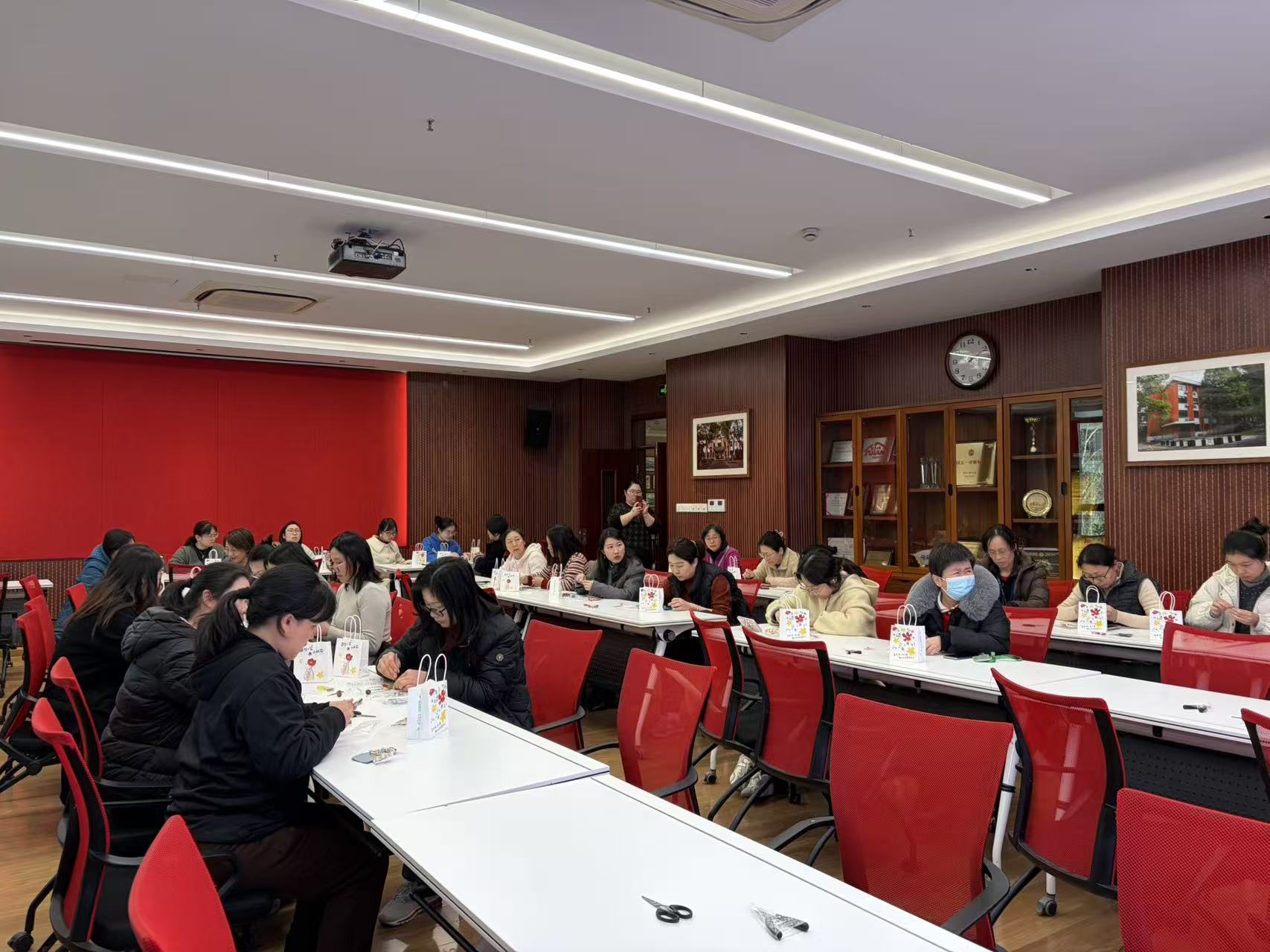 首先学院分管工会工作的聂明副书记代表学院对女教职工致以节日的问候,并预祝本次活动圆满成功,希望各位女教职工能够借助本次活动放松压力、舒缓身心、玩得开心。随后开始特色体验环节,本次沙龙紧扣 “「植」愈身心,包揽美好” 的核心主题,创新性地将传统吉祥意象、自然疗愈理念与实用手作体验相结合,既贴合女性的审美需求,又彰显了学院对女性群体的人文关怀。活动现场布置温馨雅致,草木香与皮革的天然气息交织,专业指导老师提前备好材料包与工具,并提供视频教程和现场展示与指导。