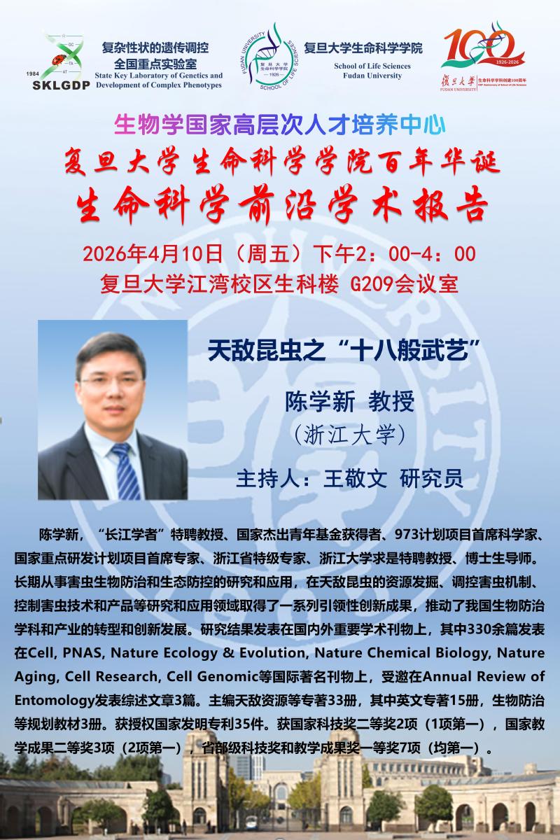 生命科学前沿学术报告--2026-04-10(周五)下午 2:00 ,陈学新 教授 (浙江大学)