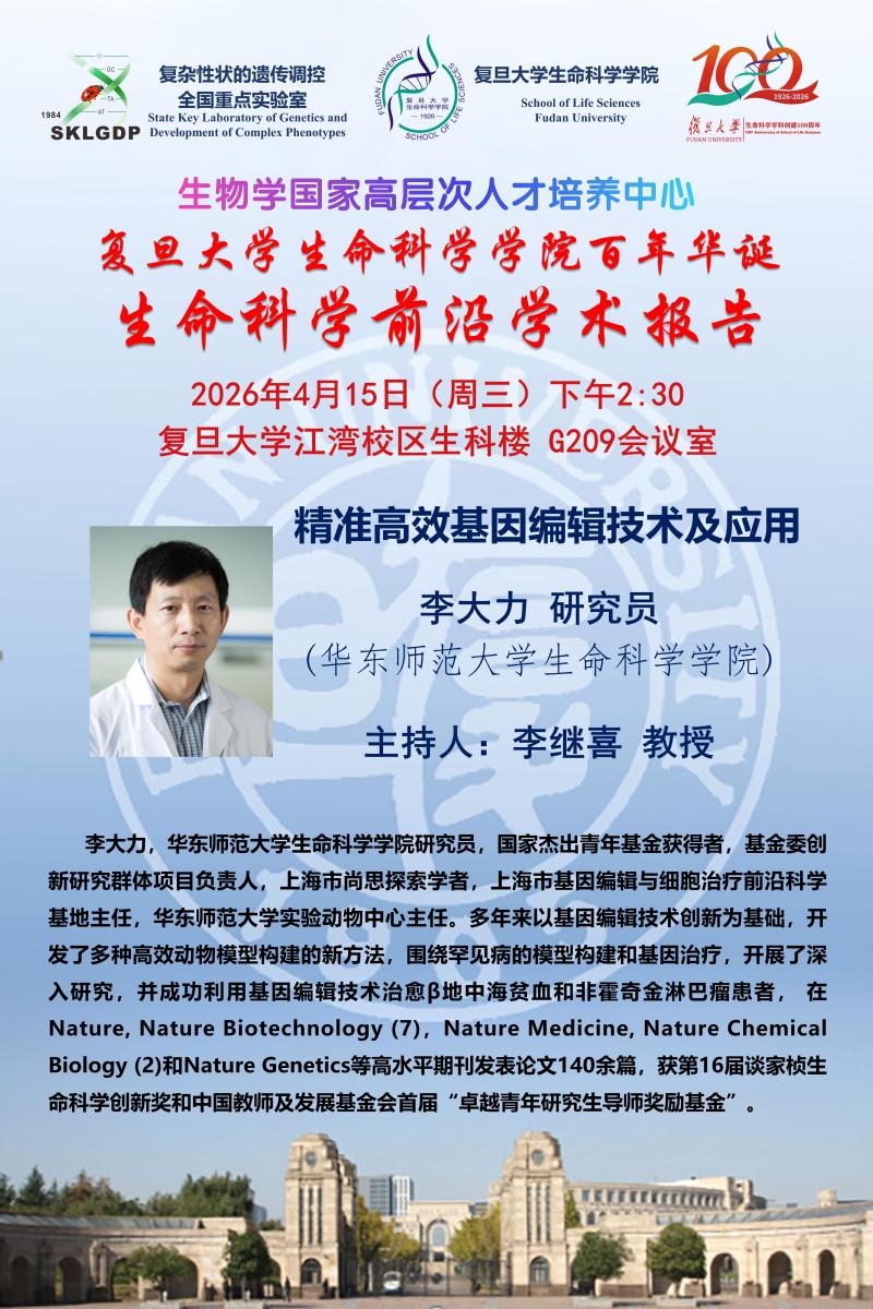生命科学前沿学术报告--2026-04-15(周三)下午 2:30,李大力 研究员 (华东师范大学生命科学学院)