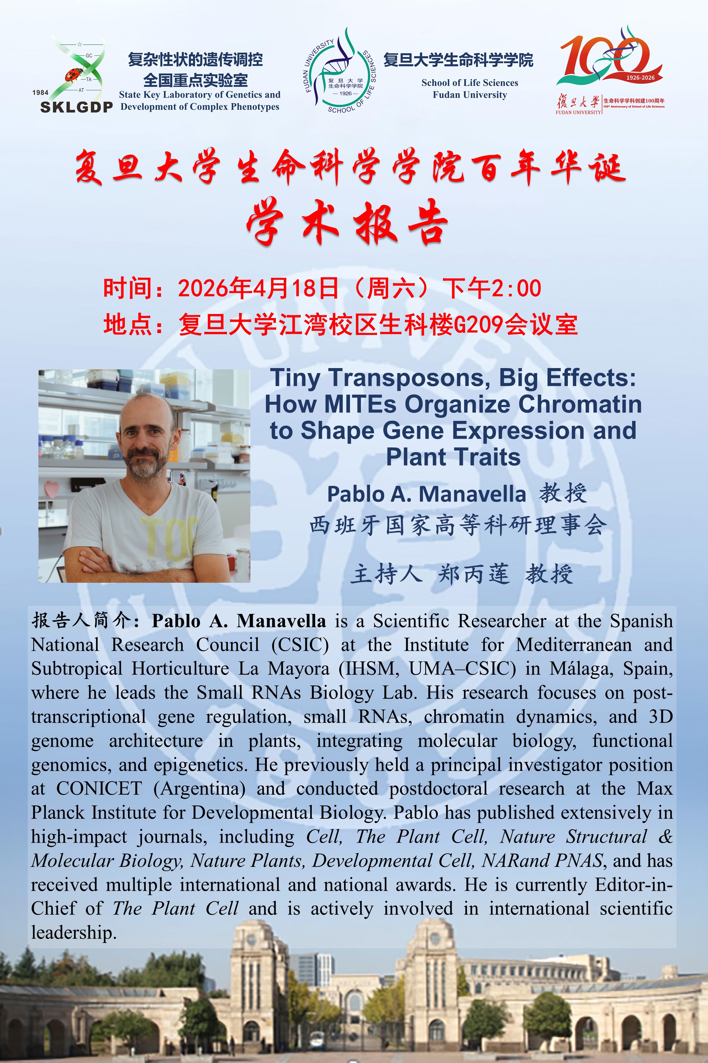 生命科学前沿学术报告--2026-04-18(周六)下午 2:00,Pablo A. Manavella 教授(西班牙国家高等科研理事会)