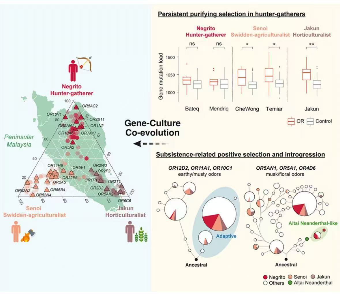 在人类演化历程中,感官系统始终是连接机体与环境的关键桥梁。人类如何通过感官感知适应多样化生态环境,是演化生物学长期关注的重要问题。其中,嗅觉作为一种古老而基础的感知方式,在觅食、识别环境、规避危险及社会交流等过程中发挥着重要作用。随着人类从原始社会逐步走向农业社会,“嗅觉退化”的观点一度占据主流认知。然而,近年来的研究不断表明,人类嗅觉系统在不同生态与文化背景下仍维持显著的功能与遗传多样性。尤其是,不同生业模式塑造了差异化的气味环境与感知需求。例如,在马来西亚土著人群中,狩猎采集与农耕人群在气味辨别与描述能力上存在显著差异,且嗅觉在食物采集与药用植物选择等关键行为中发挥重要作用。尽管行为学和语言学证据已提示狩猎采集人群在嗅觉感知与表达方面可能具有系统性优势,但其背后的遗传基础及演化机制仍有待系统解析。