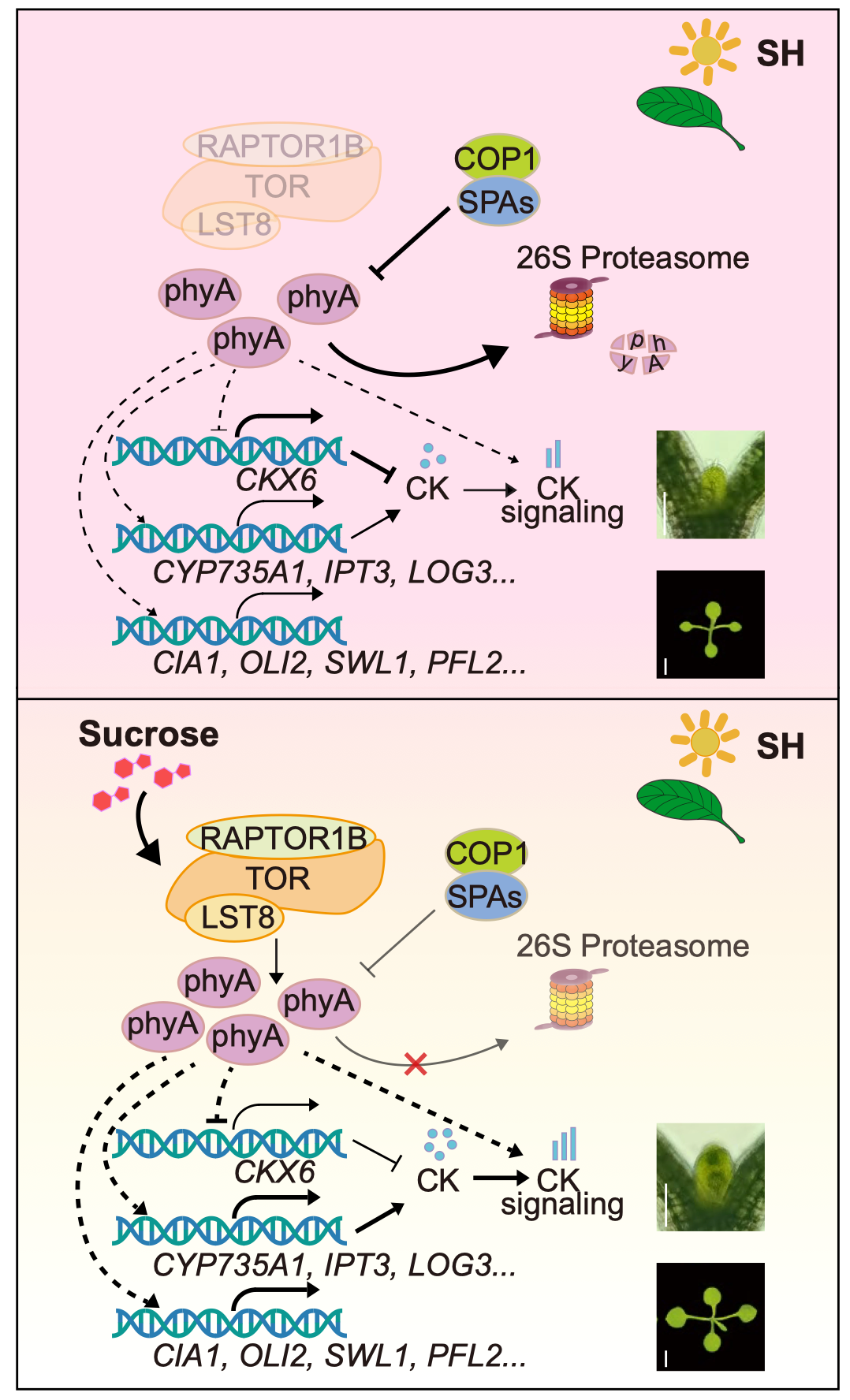 外源蔗糖通过TOR与phyA信号网络调控遮荫条件下真叶发育的工作模型:在荫影条件下,TOR活性降低,phyA在细胞核中积累,并受到COP1/SPA复合体介导的降解。外源蔗糖可激活TOR,TOR复合体与phyA相互作用,从而干扰phyA与COP1/SPA的结合并提高phyA稳定性。稳定的phyA进一步调控下游基因的转录表达,包括细胞分裂素合成与代谢相关基因,从而提高活性细胞分裂素水平,增强细胞分裂素信号,最终促进真叶发育。